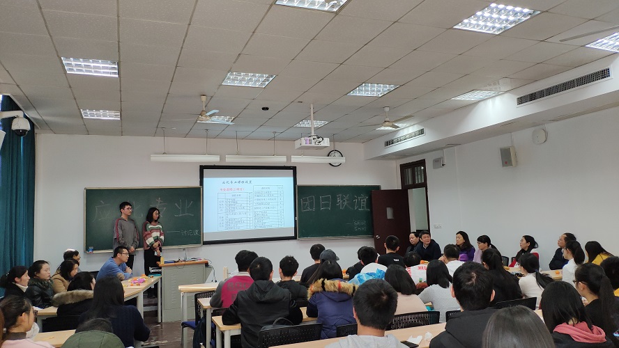 随着同学们填写了一份关于应用化学的专业问卷后,于中楼进行的经验交流会也拉开了序幕。本次活动先由一段介绍化学物质的视频导入,然后由两位团支书为同学们介绍出席此次活动的老师及老师们的各自的专业领域和教学科目。在介绍完之后,就进入了提问环节。