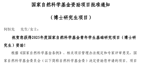 博士生何恒先获批2025年度国家自然科学基金青年学生基础研究项目(博士研究生)