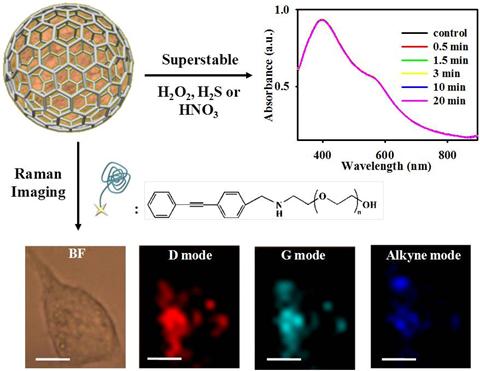 石墨烯纳米材料有优异的机械、光学和电学性能,而且具有化学和热稳定性。课题组利用薄层石墨烯有效的保护了银纳米粒子在不同环境中的优异性能,在高浓度的过氧化氢、硫化物甚至硝酸的存在下,颗粒的等离激元性能都能得到很好的保持。此外,通过表面炔基分子修饰,结合石墨壳层特异的拉曼信号还实现了对肿瘤细胞的低背景快速成像,提高了颗粒探针在生物医学领域应用中的灵敏度和稳定性。进一步通过结合肿瘤靶向的核酸适配体,还实现了对肿瘤细胞和组织的靶向拉曼成像,对于癌症诊断具有重要的意义。