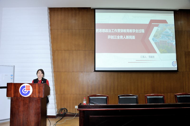 党委副书记、纪委书记范媛吉同志以《把思想政治工作贯穿教育教学全过程开创三全育人新局面》为题,与全体参会人员一起认真学习了习近平总书记在全国高校思想政治工作会议上的讲话、习近平总书记在全国教育大会上的讲话和习近平总书记在学校思政理论课教师座谈会上的讲话等重要文件精神,并介绍了兄弟院校在思政工作方面一些好的做法和经验。