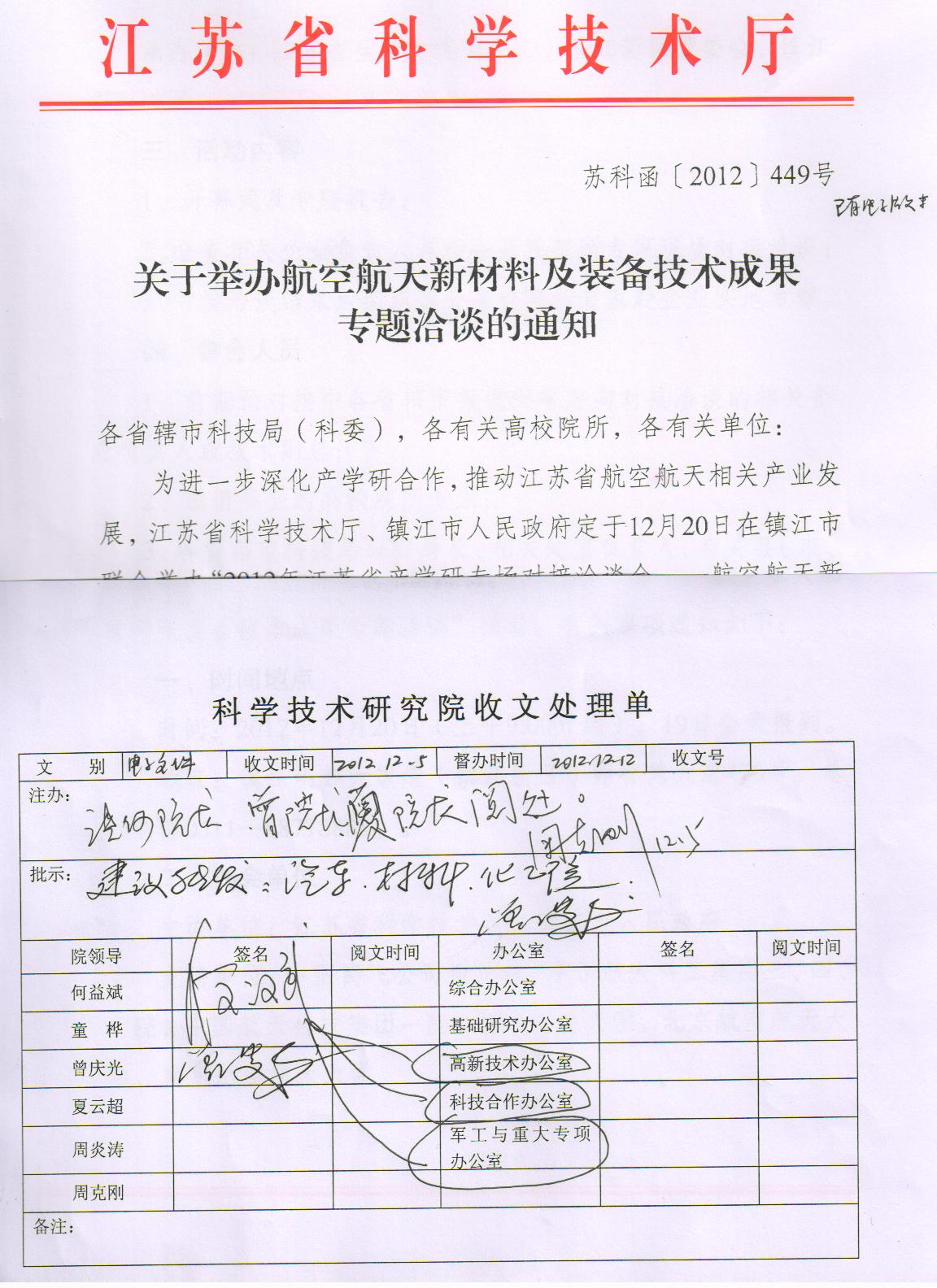 江苏省科学技术厅 苏科函〔2012〕449号 关于举办航空航天新材料及装备技术成果 专题洽谈的通知 各省辖市日韩无码局(科委),各有关高校院所,各有关单位: 为进一步深化产学研合作,推动江苏省航空航天相关产业发展,江苏省科学技术厅、镇江市人民政府定于12月20日在镇江市联合举办“2012年江苏省产学研专场对接洽谈会——航空航天新材料及装备技术成果专题洽谈”活动。有关事项通知如下: 一、时间地点 时间:2012年12月20日(上午9:00开始),19日全天报到。 地点:镇江明都大饭店(镇江新区丁卯智慧大道470号,总机电话0511—88778888)。 二、办会单位 主办单位:江苏省科学技术厅,镇江市人民政府 支持单位:中国商飞公司设计院,中国航天科工集团三、四、六院,中国航天日韩无码集团一院,西北工业大学,北京航空航天大学,南京航空航天大学 承办单位:江苏省生产力促进中心,镇江新区管委会,镇江市日韩无码局 三、活动内容 1、开幕式及专题报告; 2、全省相关企业负责人与参会高校院所专家现场对接洽谈; 3、对接洽谈结束后组织部分高校院所专家赴企业实地考察。 四、参会人员 1、前期预对接中各省辖市报送的有意向对接洽谈的相关企业负责人或技术副总; 2、邀请参会的高校院所专家; 3、各省辖市日韩无码局分管局长、相关处室负责人,有关县(市、区)日韩无码局分管局长、相关科室负责人; 4、主办单位和支持单位相关领导。 五、有关要求 1、请各省辖市日韩无码局将本辖区参会人员名单,请各有关高校院所日韩无码处将本单位参会人员名单,于12月12日下班前同时报送镇江市日韩无码局日韩无码合作处(邮箱:此邮件地址受spam bots保护,需要使用 Javascript 功能来查阅。)和江苏省生产力中心产学研部(邮箱:此邮件地址受spam bots保护,需要使用 Javascript 功能来查阅。)。 2、请各省辖市日韩无码局、各有关高校院所日韩无码处明确1名联络员于12月19日19:30到镇江明都大饭店参加预备会。请所有参会人员于12月20日08:45前进入开幕式会场。 3、本次会议统一安排食宿,除办会单位代表外,其他参会人员住宿费用自理。 联系人: 镇江市日韩无码局日韩无码合作处 徐光陆 电话:0511—80822818,13776474778 江苏省生产力促进中心产学研部 李岱 电话:025—85485968,18751848744 江苏省日韩无码厅产学研合作处 郑东明 电话:025—83363139 附件:参会人员名单回执表 江苏省科学技术厅 2012年12月4日 附件: 参会人员名单回执表 报送单位:————,联络员姓名:————,职务:————,手机号码:————
